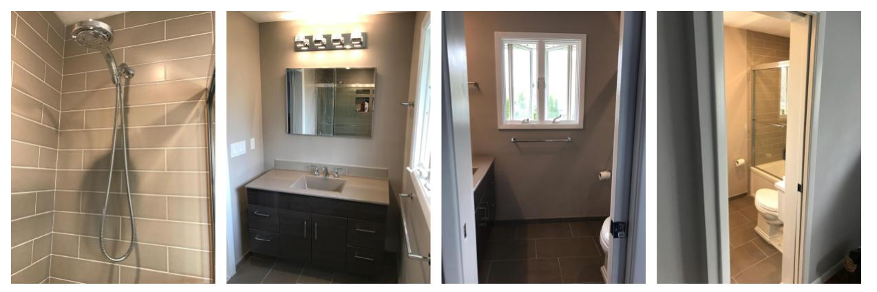 First, a complete bathroom gut was completed, followed by; the installation of pocket doors, framed in front of the existing wall to create more room in the bathroom.